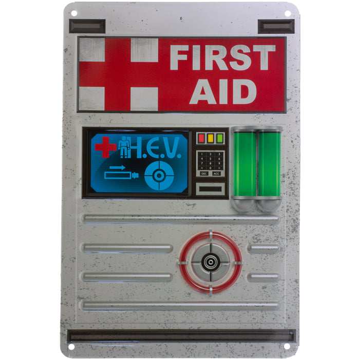 • Cartello in metallo con l'immagine di una stazione di rigenerazione della salute di un noto sparatutto in prima persona