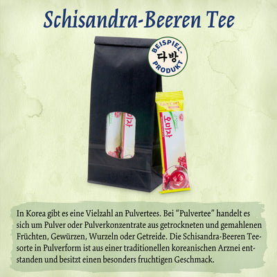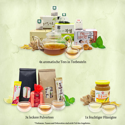 Die enthaltenen Teesorten reichen von Buchweizen-Tee in Teebeuteln, wie wir sie in Deutschland auch kennen, über marmelade-artige Fruchtkonzentrate bis hin zu Getreide- und Fruchtpulvern, die du mit heißem oder kaltem Wasser aufgießen kannst.