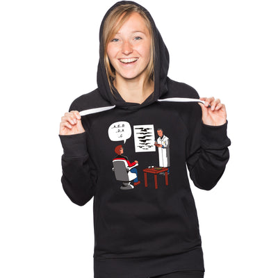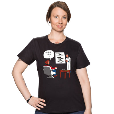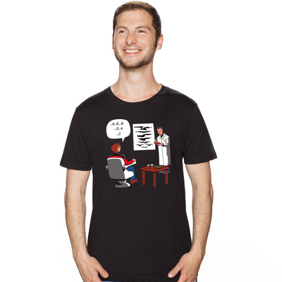 Dieses T-Shirt zeigt einen humorvollen Austausch zwischen einem Augenarzt und seinem Patienten, einem Star Trek-Fan. Anstelle der traditionellen Sehtesttafel mit Buchstaben zeigt die Wand Bilder von Raumschiffen, die für die Serie typisch sind. Jedes Schiff trägt eine alphabetische Bezeichnung, wie sie im Star Trek-Universum üblich ist - wie zum Beispiel das berühmte Raumschiff Enterprise, dessen Modelle mit Buchstaben von A bis E (und darüber hinaus) durchnummeriert sind. Der Witz dabei ist, dass der an seiner Uniform erkennbare Star Trek-Fan die Schiffe nicht nur identifizieren, sondern auch als Buchstaben für den Sehtest verwenden kann.