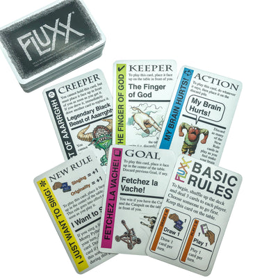 Ein Spiel wie Fluxx kurz und knapp zu erklären, ist gar nicht mal so einfach – obwohl es in diesem verrückten Kartenspiel nur eine feste Regel gibt: Du ziehst pro Runde eine Karte und musst eine Karte ausspielen. Und der Rest des Spiels ist pures Chaos! Denn in jeder Runde kommen neue Regeln, neue Siegbedingungen und andere verrückte Dinge dazu!