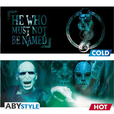 Wie wir alle wissen, zieht der kaltblütige Lord Voldemort es – ähnlich wie seine blutdurstige Schlange Nagini – vor, sich im Kühlen und Dunklen aufzuhalten. Das ändert sich mit dem Harry Potter Todesser Thermo-Effekt-Becher! Denn während der Becher sich im kühlen Zustand befindet, zeigt er das Dunkle Mal, mit dem die Todesser magisch gebrandmarkt wurden, sowie Lord Voldemorts unheimlichen Beinamen: He Who Must Not Be Named (Dt.: Er, dessen Name nicht genannt werden darf). Doch wenn du ein heißes Getränk in den Becher gibst, erscheint plötzlich der Dunkle Lord selbst, und auch seine Anhänger mit den chrakteristischen Masken aus den Harry Potter-Verfilmungen. Wenn der Becher abkühlt, tauchen die Erzfeinde Harry Potters wieder ins Dunkel ab und kommen erst beim nächsten Heißgetränk wieder ans Licht...