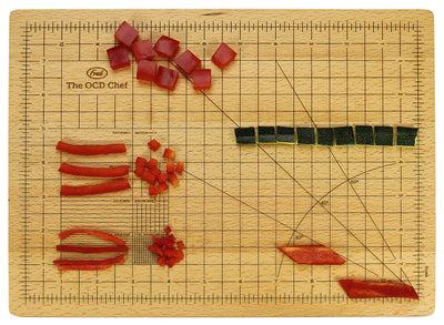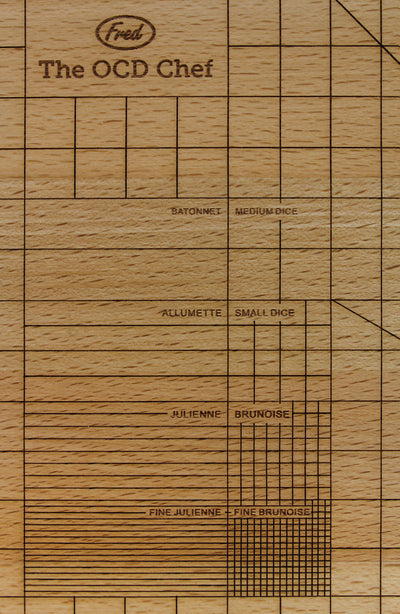 Das OCD (Obsessive Chopping & Dicing) Schneidebrett aus Buchenholz ermöglicht extrem genaues Schnippeln, Hacken und Schneiden. Mit vorgegebenen Linien ist exaktes Arbeiten wie in der Profi-Küche möglich. Karottenstreifen in Größen wie Batonette, Allumette, Julienne und Fine Julienne sind eine Leichtigkeit. Übermäßiger Skill ist für Würfel in Medium, Small, Brunoise und Fine Brunoise (wer hätte gedacht, dass es solche kulinarischen Einheiten in der Gastronomie gibt!) ebenfalls nicht erforderlich.