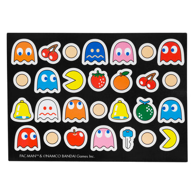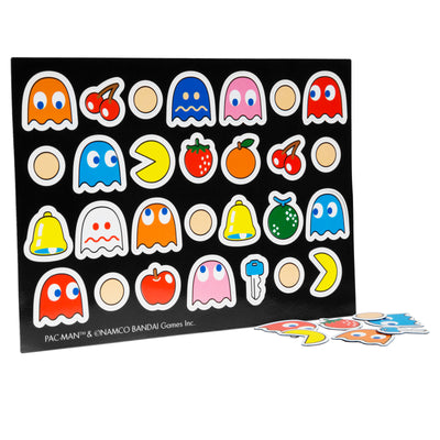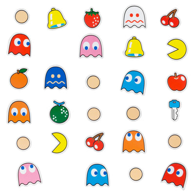 • 28 flache Magnete mit Pac-Man und seinen bunten Begleitern.
