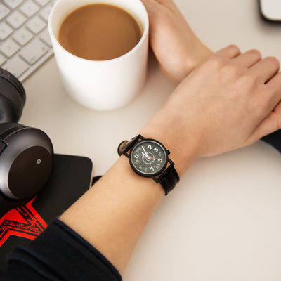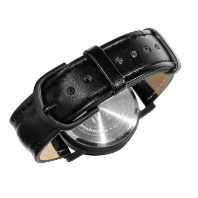 Die Armbanduhr verfügt über ein japanisches Quartz-Uhrwerk und ein schwarzes Lederarmband. Sie wird in einer dekorativen Metalldose geliefert.