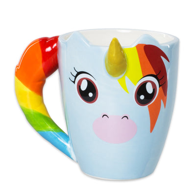 Natürlich verdienen ultimative Fabeltiere und ihre Fans auch einen ultimativen Becher: den Regenbogen-Einhorn Becher! Dieser rundum bedruckte Becher erstrahlt in himmlischem Blau und zeigt das Konterfei eines echten Einhorns, das mit seiner kecken Haartolle und dem Regenbogenschweif Stilsicherheit hoch zehn beweist. Aber es gibt noch mehr zu entdecken: Das putzige Einhorn verfügt über ein dreidimensionales Horn, das aus dem Becher hervorragt und förmlich dazu einlädt, Löffel darauf zu balancieren, Teebeutel festzubinden und Eheringe aufzuhängen. Du siehst also: Auch im Bereich der Haushaltsgegenstände können Einhörender auf ganzer Linie überzeugen.