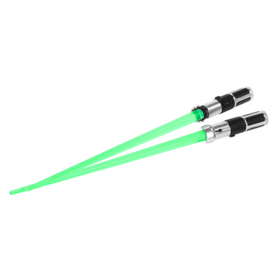 Die Essstäbchen besitzen einen kleinen Schalter am Griff, mit dem sich das Licht dauerhaft an- oder ausschalten lässt. Für den Überraschungseffekt sieht man erst wenn das Licht an ist, dass du hier zwei Miniaturlichtschwerter Typ Yoda in der Hand hast. Vorausgesetzt, Du verbirgst den Griff. ;)