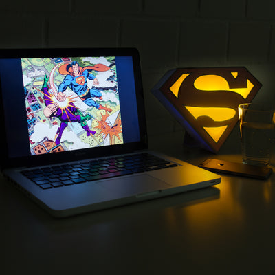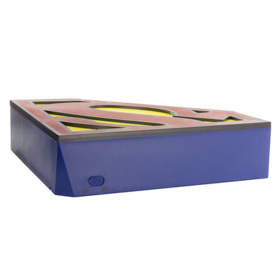 Mit dem Superman Logo Licht kannst Du zwar nicht Kal-Els Fähigkeiten wie übermenschliche Geschwindigkeit, Stärke oder den Röntgenblick erlangen, dafür aber Deine Wohnung enorm verschönern. Die Lampe, die das seit den 60er Jahren verwendete Logo Supermans darstellt, kannst Du entweder mit dem beigefügten Standfuß aufrecht hinstellen oder mit zwei Nägeln (nicht enthalten) an der Wand montieren. Für den Betrieb benötigst Du ansonsten nur noch einen USB-Port für das enthaltene Micro-USB-Kabel oder alternativ drei AA-Batterien (nicht enthalten). Über einen diskreten Schalter an der Seite kannst Du das Logo schließlich zum Leuchten bringen.