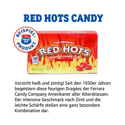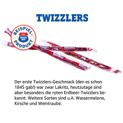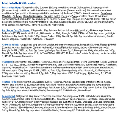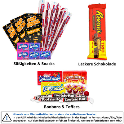 Außerdem findest du in deiner Überraschungsbox mit 19 amerikanischen Süßigkeiten noch Schokolade, Kaubonbons und weitere Candys, die wir hier natürlich noch nicht verraten wollen. Die genaue Zusammensetzung der Box kann variieren, da wir immer auf der Suche nach neuen Köstlichkeiten sind, um etwas Abwechslung in die Box zu bringen.