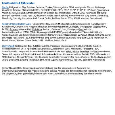 Bitte beachte: Einige der Snacks enthalten Zutaten tierischen Ursprungs wie Gelatine und sind somit nicht für eine vegetarische, vegane oder muslimische Ernährungsweise geeignet. Andere Süßigkeiten sind aus rein pflanzlichen Zutaten hergestellt, sodass für jeden etwas dabei ist. Die genauen Zutaten der einzelnen Süßigkeiten findest du auf der Rückseite der Box.