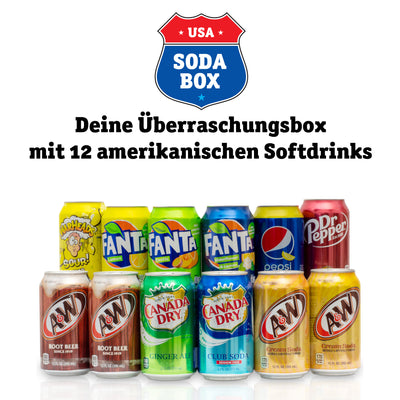• Überraschungsbox mit 12 zufällig ausgewählten Dosen amerikanischer Softdrinks