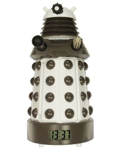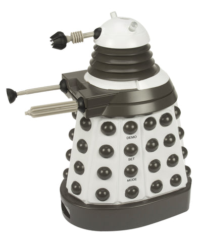 The Dalek projection alarm clock not only displays the time on its LED screen, but also projects it onto the ceiling in blue digits. You will be woken up by one of three typical Dalek sound effects: The "Exterminate!" exclamation, the incomparable locomotion sound or the weapon sound, while its lights flicker like lightning above and below.