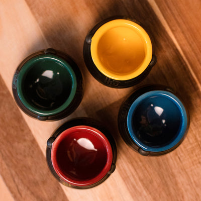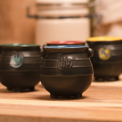 And we have the right cups for it: The Harry Potter Cauldron Espresso Cup Set consists of 4 small ceramic espresso cups that look like the cauldrons from the potion class at the School of Witchcraft and Wizardry! Each cup represents one of the Hogwarts houses through the characteristic color and the small crest on the outside. Additionally, each mini cauldron bears the official Harry Potter logo.