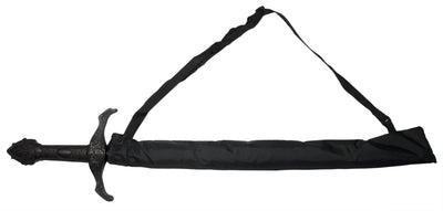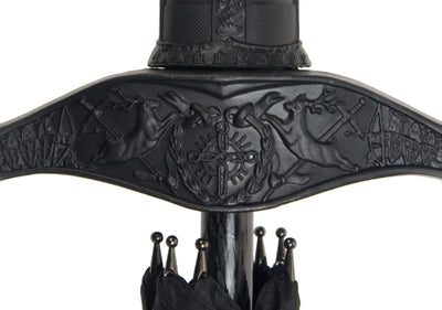 The Knight's Sword Umbrella is a black cane umbrella with an extra-long handle that looks like that of a knight's sword. The Knight's Sword Umbrella is very high quality and made of sturdy plastic, metal, and fabric. Directly above the handle is a button that allows you to automatically open the umbrella.