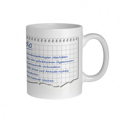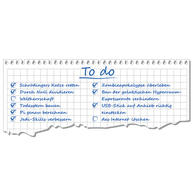 However, if you currently don't have any ideas for a proper to-do list, you can simply present the To-Do Mug as a substitute. On this ceramic mug, you'll find the list of all lists: The creator has already built a Death Star, divided by zero (!), and even inserted a USB stick correctly on the first try! One list to rule them all, one list to find them, one list to bring them all and in the darkness bind them... ;)