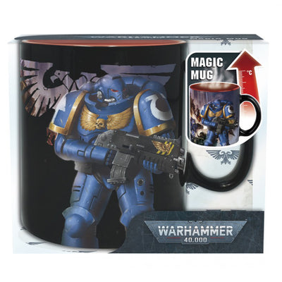 Der Thermoeffekt-Becher zeigt zwei Space Marines in ihrer übermenschlichen Pracht: Ein blauer Ultramarine, der für das Imperium kämpft, und ein Krieger der Black Legion, der dem Befehl von Abaddon dem Vernichter untersteht. Wenn du nun eine heiße Flüssigkeit wie Kaffee, Tee oder heiße Schokolade in den Becher gibst, wird im Hintergrund die erbitterte Schlacht zwischen den beiden Truppen sichtbar. Kühlt der Becher ab, sind wieder nur die beiden Space Marines zu sehen.