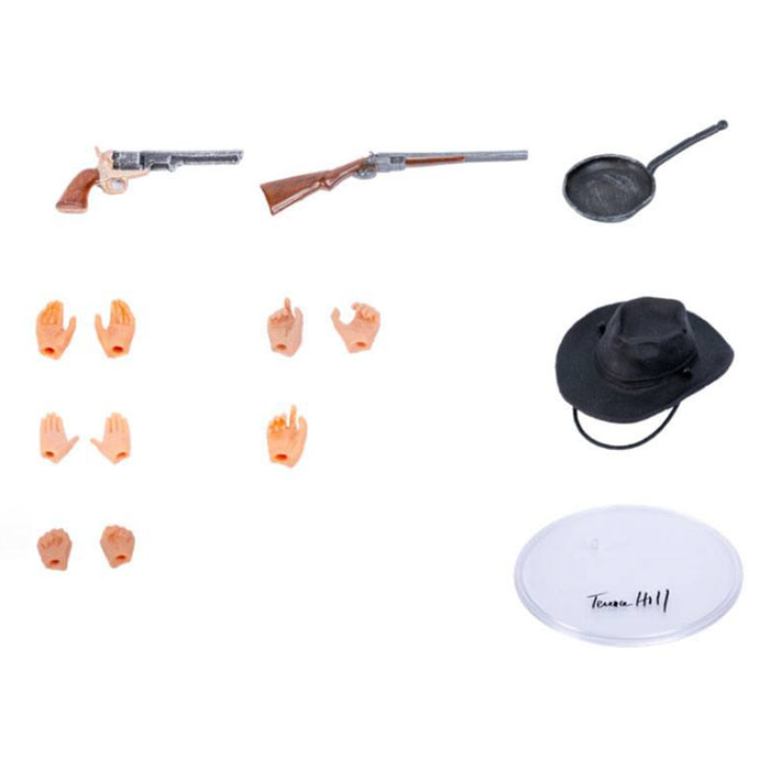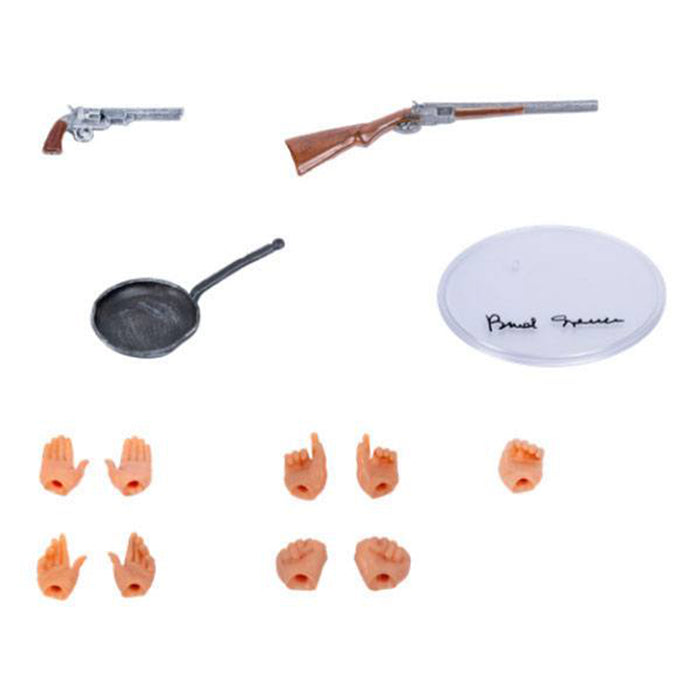 These two action figures represent the characters Trinity or Tired Joe (played by Terence Hill) and Bambino or The Little One (played by Bud Spencer) from the classic film. Both stand on transparent platforms decorated with the signature of the respective actor. And there are a range of accessories for both characters, including a gun holster, various firearms (and a frying pan) and several pairs of interchangeable hands. Terence Hill's character Trinity also wears the signature hat. The action figures are movable at the "joints" and can therefore be put into all kinds of poses.