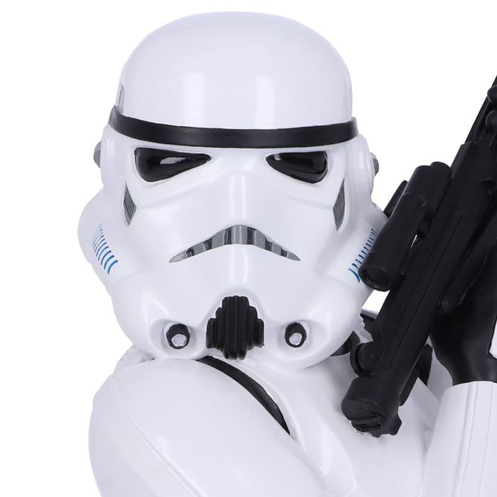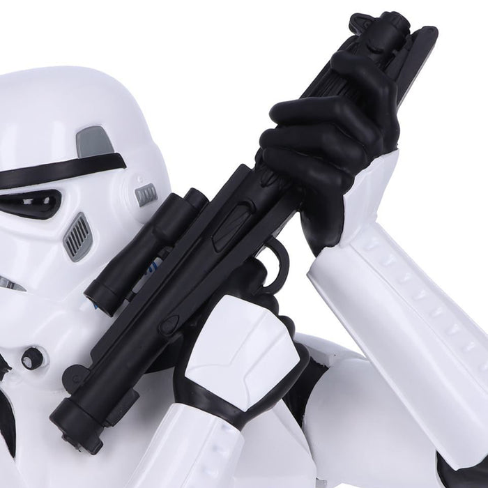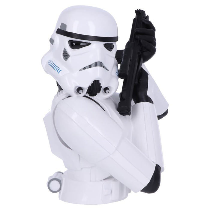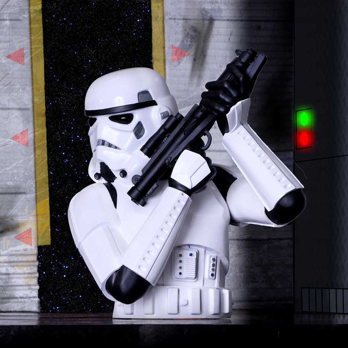 The Stormtrooper bust looks like the top half of a Stormtrooper from the Star Wars franchise. The intricately sculpted white armor, distinctive helmet and blaster rifle are of course all based on the originals from the films and are carefully hand-painted. The bust of the trigger-happy Empire soldier measures a good 30 cm, making it an impressive addition to your collector's shelf (or anywhere else in your nerdy home) ;)