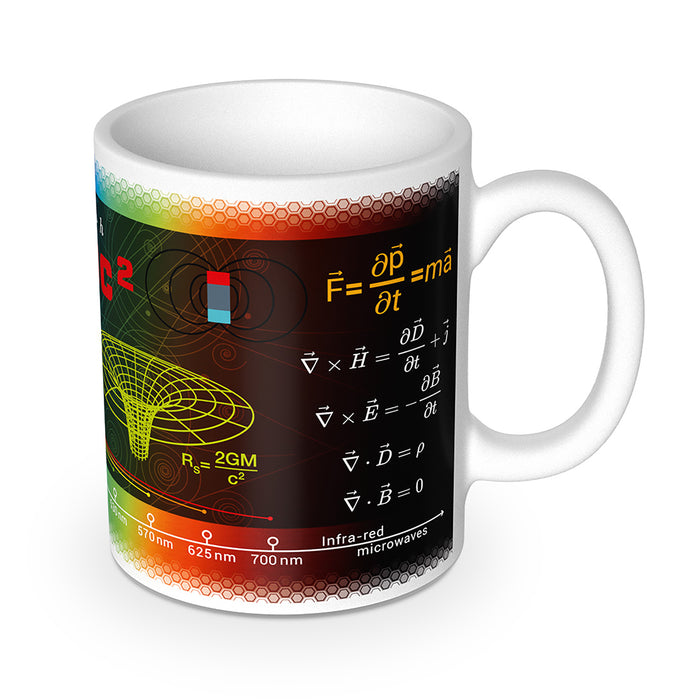 The design of the cup, which is printed all around, leaves no doubt as to what physics can calculate: just about anything. In addition to the classic E=mc², you will also see old acquaintances such as Newton, Maxwell and the Schwarzschild radius. And if you want to quickly discuss the legendary Pink Floyd album cover, you will also find the spectrum of visible light including a practical scale in nanometers. Let someone tell me again that physics has nothing to do with rock stars ;)