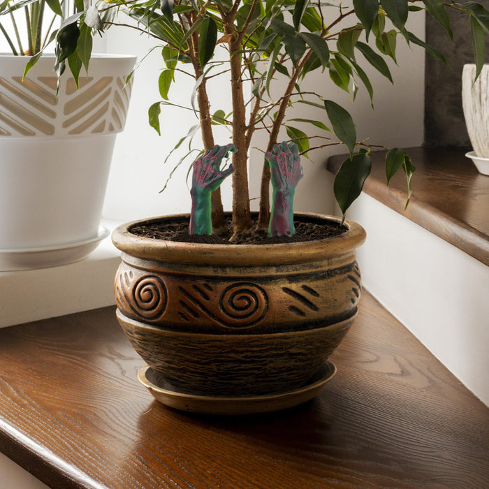 Simply stick the two zombie hands into the soil at the desired distance and they will look like they are reaching up out of the darkness and moisture of the soil! The green and red color and the protruding veins are the perfect details, as they make it clear that this is an awakened undead that is fighting its way out of its grave.