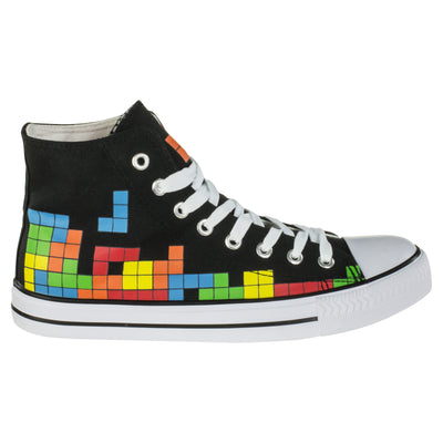 El diseño de las zapatillas es clásica y simple: la suela blanca, la tapa de goma y los cordones se destacan del textil negro. Los zapatos están altos del tobillo y tienen ocho ojales. La colorida presión con el popular juego de apilamiento se adapta al estilo atemporal. ;) Además de los bloques que ya se han apilado, en los que una pieza L se está hundiendo, la pestaña, por así decirlo, representa la vista previa del siguiente bloque, aquí hay un bloque de Z naranja, que puede También use para el próximo tren. :)