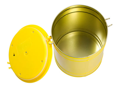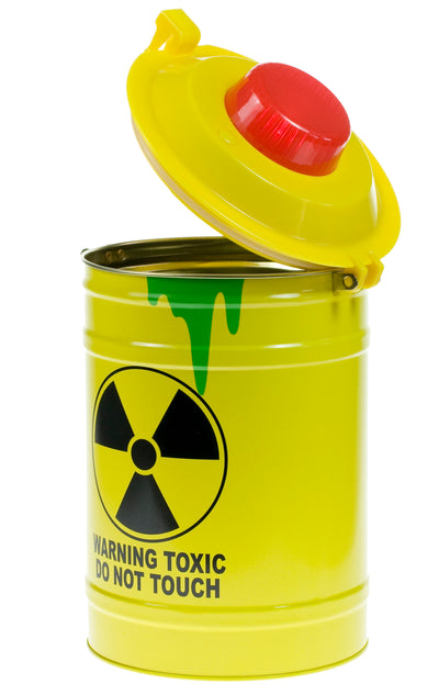 La caja de galletas de residuos tóxicos está hecha de metal y la tapa de plástico.