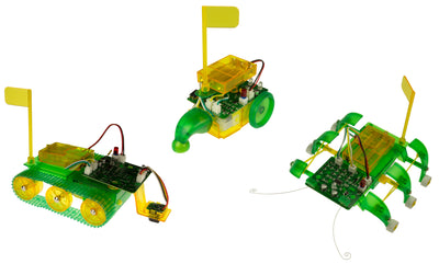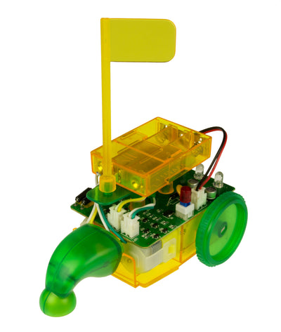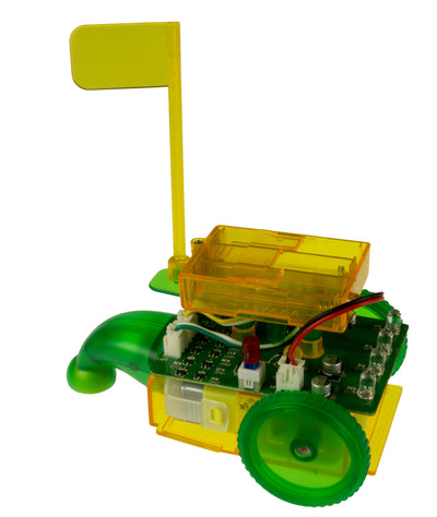 El Shake Shake Robot, por otro lado, con su apariencia de remolque y una longitud de 12 cm, es a primera vista el más discreto, pero posiblemente también el representante más interesante de la familia de robots. Su ruta de viaje se programa agitándolo previamente. Cada tipo de agitación corresponde a un movimiento de viaje específico. El Shake Shake Robot puede almacenar hasta 15 comandos, por lo que no hay impedimentos para maniobras complejas. Es la mejor opción para pequeñas competiciones o incluso minigolf.