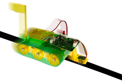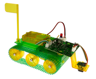 El Dark Line Tracer es un vehículo similar a un tanque con una longitud de aproximadamente 17,5 cm, que se distingue por su fidelidad a la línea. Si se coloca en una línea negra bien visible de aproximadamente 1 cm de ancho, gracias a sus dos sensores de luz, es capaz de reconocerla y seguirla fielmente.