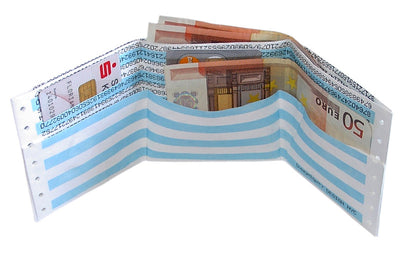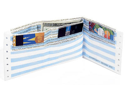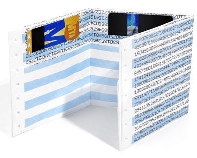 El diseño de esta billetera imita el antiguo papel de impresora continua y en el papel se encuentran los primeros 3000 caracteres de Pi, impresos con apariencia de impresora matricial. La cartera tiene 6 espacios para tarjetas de crédito y un compartimento para billetes, que permite esconder y asegurar los billetes mediante una lengüeta. El material es repelente al agua y ligeramente elástico, por lo que se adapta perfectamente al contenido. Ten en cuenta que no hay un compartimento para monedas.