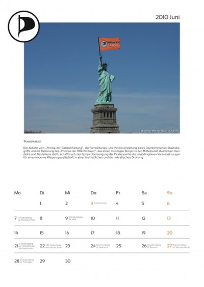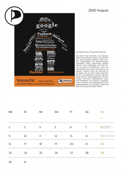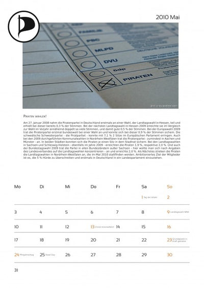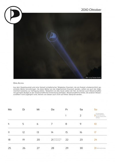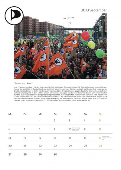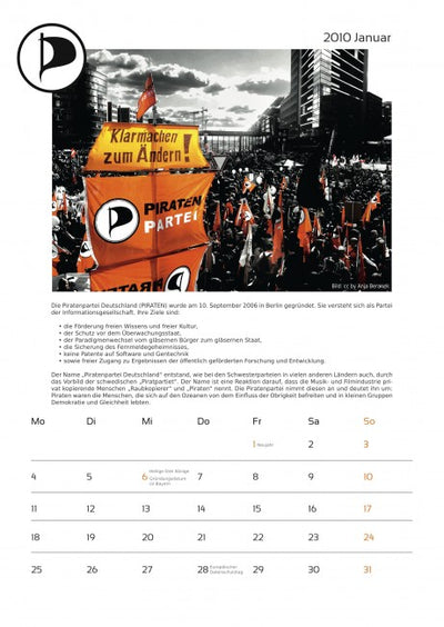 Cada mes está acompañado de una imagen pirata y un texto sobre temas piratas, y el calendario ya incluye algunas fechas importantes para los piratas. Un aviso más: en octubre, lamentablemente, se olvidó mencionar a la empresa que proporcionó fuertemente subvencionada la máquina de proyección a los piratas. Por lo tanto, aquí una vez más el agradecimiento a Oliver Bienkowski de Lightartist.