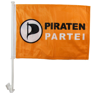 Bandera con el logo del Partido Pirata para la ventana lateral de tu coche. La bandera viene con un asta que tiene un soporte que se puede fijar fácilmente a la ventana lateral. Simplemente baja un poco la ventana del coche y coloca la bandera en la ventana. Al subir la ventana, puedes asegurar la bandera de manera segura.