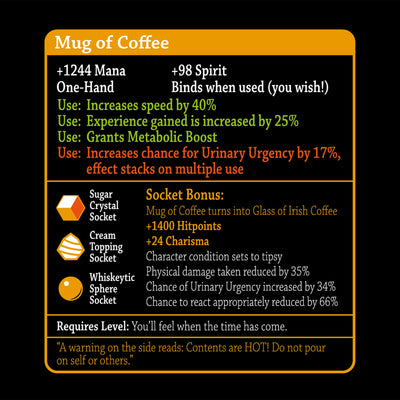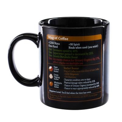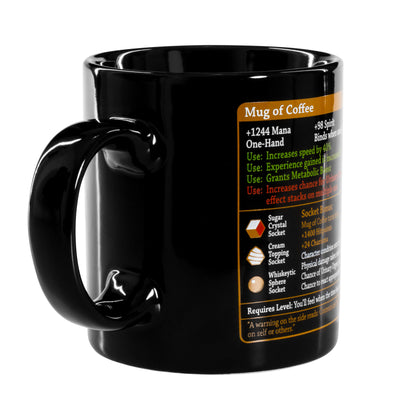 ¿Cuáles son las propiedades especiales del Taza de café? En primer lugar, el más importante, +1244 Mana y +98 Spirit. Está claro que su cabeza se volverá más rápido a través del café. Por supuesto, el efecto mejora el zócalo correcto. Un poco de azúcar trabaja milagros, whisky, por otro lado, también lleva uno u otro riesgo ... y considere: cuanto más café beba, más a menudo tendrá que tomar un descanso forzado. ;)