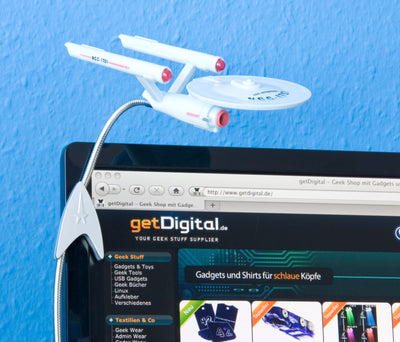La Star Trek Webcam es un pequeño modelo de la USS Enterprise NCC 1701, es decir, de la serie original con el Capitán Kirk. Su cámara, con una resolución de 640x480 píxeles que captura 30 imágenes por segundo, se encuentra en la sección de máquinas en la parte inferior de la Enterprise. Cuando conectas la Star Trek Webcam, dos LEDs rojos en las góndolas warp indican que la cámara está activada. Para encontrar la posición correcta para filmar, puedes colocar la cámara web en el escritorio con el cuello de cisne flexible o pegarla al monitor con la pieza de fijación deslizante en forma del logotipo de Starfleet.