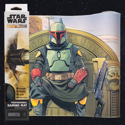 Da ist es nur logisch, dass einer der gefürchtetsten Kopfgeldjäger der Galaxis auf dieser Mousemat zu sehen ist, schließlich ist Boba Fett bekannt dafür, seinen Blaster besonders schnell zu zücken. Und weil dieses Mousepad extra breit ist, hat auch noch sein Schiff, die Slave I, Platz darauf gefunden.