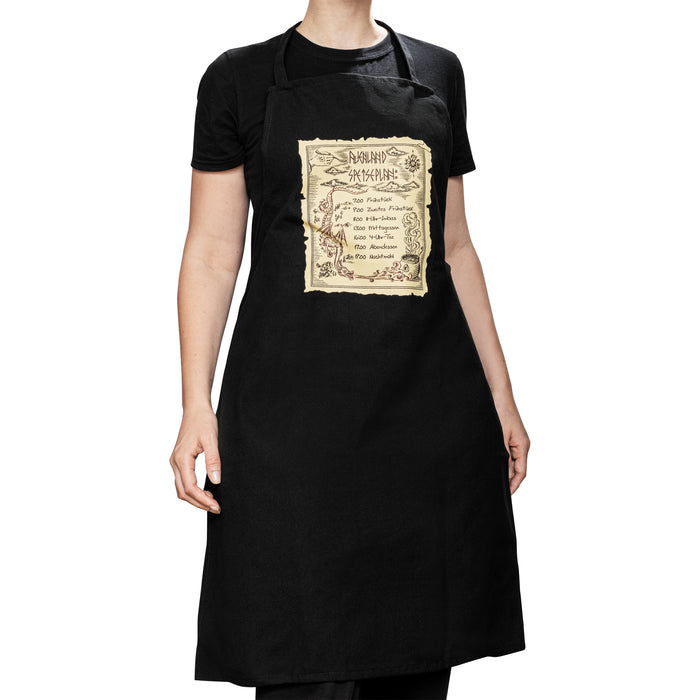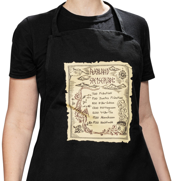 El delantal negro muestra con detalle el menú de los cavernícolas descalzos. Se lleva alrededor del cuello y atado a la altura de la cintura con las dos cintas. Después de usarlo, puedes lavarlo en la lavadora a 30° C. También es apto para secadora y se puede planchar a baja temperatura.