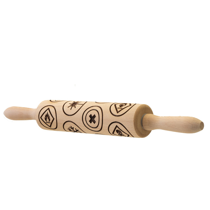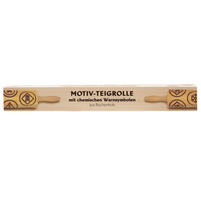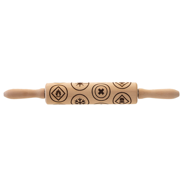 • Rodillo de masa con motivos de madera de haya con símbolos de advertencia comunes