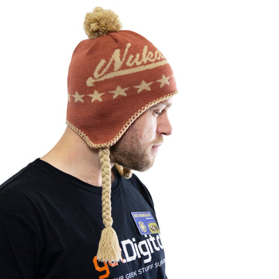 Après la guerre nucléaire dévastatrice dans les jeux Fallout, il y a surtout une chose : le froid ! Mot-clé : hiver nucléaire. Pour éviter que tes oreilles ne gèlent pendant que tu combats des mutants, des pillards et d'autres racailles, la société Nuka Cola a inventé la coiffe parfaite pour l'après-apocalypse : le Fallout Nuka Cola Inka-Beanie !