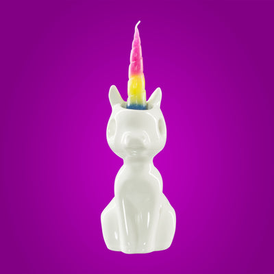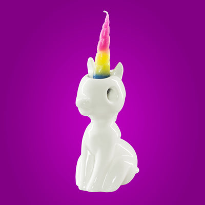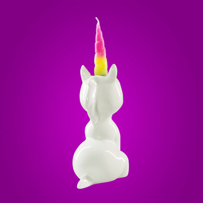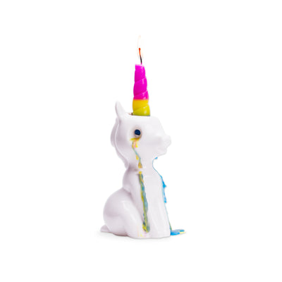 Ce bougeoir en porcelaine est inspiré d'une licorne abattue, accroupie sur le sol. Dès que tu allumes l'une des deux bougies arc-en-ciel et que la cire commence à fondre, la petite licorne ne peut plus se contrôler et commence à pleurer de grosses larmes. Les couleurs vives des larmes font que la noble créature mythique a l'air leiiiicht creepy. Si ta licorne a pleuré toutes ses larmes, tu peux l'aider en utilisant les Bougies de remplacement tu pourras te venger de toutes ces années de produits horribles pour les licornes. ;)