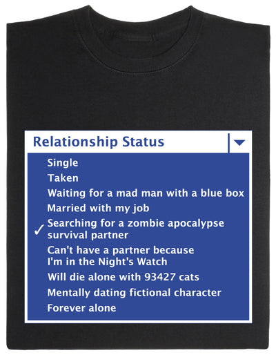 Nous avons pris l'habitude d'informer notre entourage ainsi que des étrangers en temps réel sur tous les détails de notre vie - bien sûr, aussi sur notre statut de relation actuel. Malheureusement, l'holographie n'est pas encore assez avancée pour que le statut apparaisse toujours à côté de notre tête dans la vie réelle. Nous résolvons ce problème avec, bien sûr, un t-shirt. ;)
