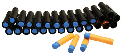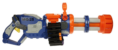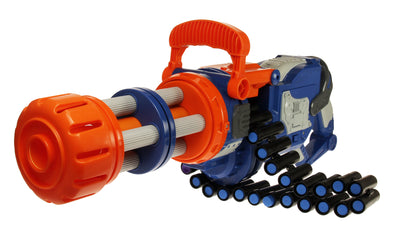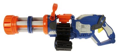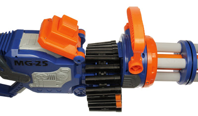 La canna del tuo blaster gira, la cinghia delle cartucce viene tirata, 25 colpi in 15 secondi! Per fortuna hai messo delle batterie fresche a casa e tutto funziona senza problemi... I proiettili di schiuma volano a quasi 11 metri (sicuramente un po' di più con un vento di coda), oh no, raffica! Ora ricarica velocemente (ok, è un po' complicato, ma ti sei esercitato innumerevoli volte, ormai lo fai praticamente ad occhi chiusi, inserendo le puntine di schiuma nella cintura in mezzo minuto)... si riparte, sempre in avanti!
