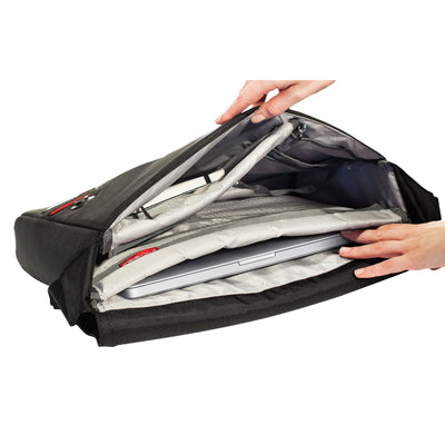 La borsa può essere chiusa con Tecnologia Fidlock bloccare e aprire. È sufficiente tirare con una sola mano per aprire la borsa, che si blocca quasi automaticamente grazie a un magnete - ma devi sapere come fare, il che rende difficile il compito dei ladri.