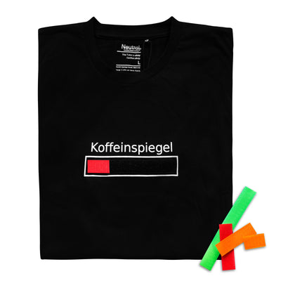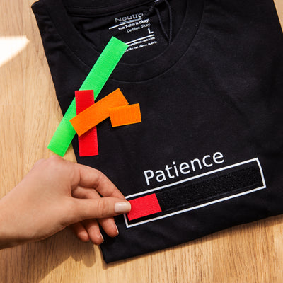 Sulla parte anteriore della maglietta troverai una striscia di velcro incorniciata di bianco sotto la scritta "Caffeine level", sulla quale potrai attaccare le tre strisce incluse nei colori rosso, verde e arancione. L'immagine a sinistra mostra un esempio di striscia in velcro. Camicia Patience Patience. Le strisce colorate possono essere facilmente tagliate in pezzi più piccoli con le forbici, in modo da poter regolare dinamicamente il tuo livello personale di caffeina. Sono finiti i giorni in cui dovevi scacciare i tuoi colleghi con un brontolio stizzito ;)