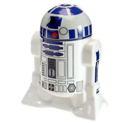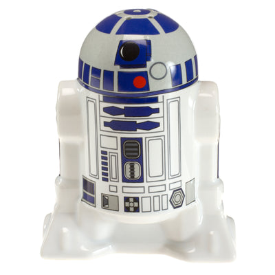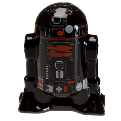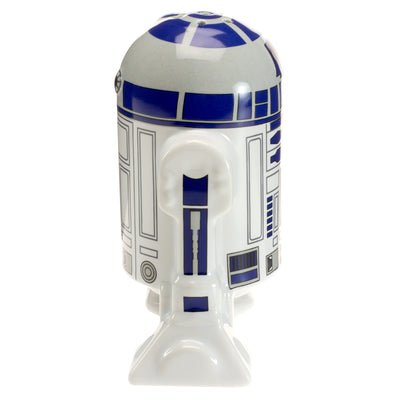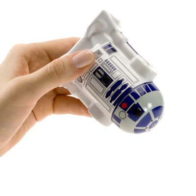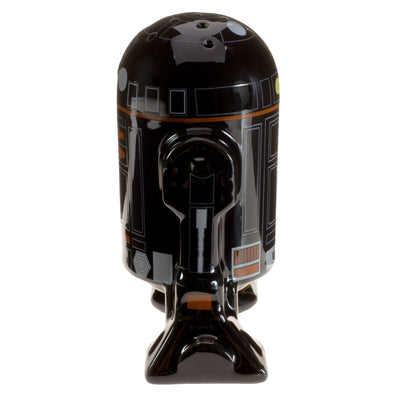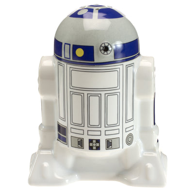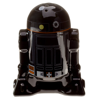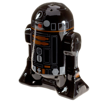 Ahi, che bello! Come gli originali, questi due droidi sono realizzati in materiale di alta qualità, in questo caso porcellana. Possono quindi essere puliti con l'acqua senza problemi, ma preferiscono evitare un lavaggio completo a causa dell'elettronica... R2-D2 è destinato al sale puro, R2-Q5 al pepe scuro. Ecco perché l'R2-Q5 nero ha qualche foro in più sulla parte superiore. Entrambi i robot possono essere facilmente riempiti dalla parte inferiore, che è sigillata con un tappo di gomma facile da rimuovere. (Garantito che non si rompono le unghie, i nervi o il cibo della famiglia).