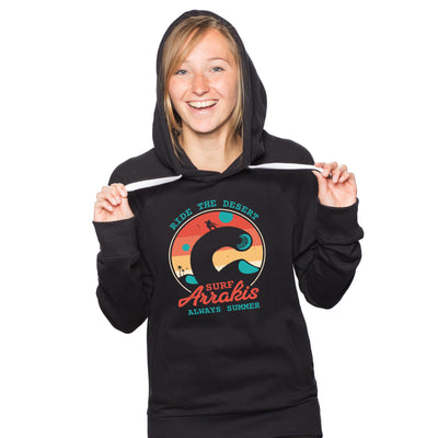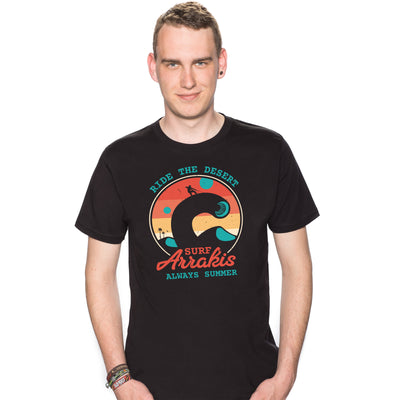 Het ontwerp van het T-shirt neemt elementen van typische surft-shirts over, die normaal gesproken golven en palmbomen tonen, en verweeft ze met de fictieve wereld van "Dune". De zin "Ride the Desert" in plaats van het gebruikelijke "Ride the Waves" en de slogan "Surf Arrakis, Always Summer" verwijzen naar de eeuwige hitte en de eindeloze zandwoestijnen van Arrakis. De algehele indruk is een humoristisch en stijlvol eerbetoon aan het verhaal en de thematiek van "Dune", waarbij de beeldtaal van de surfcultuur vakkundig wordt aangepast aan een sciencefiction-setting.