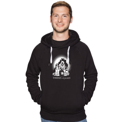 Op het "Throne of Games"-shirt kun je de mysterieuze kapdragende figuur zien, die erin geslaagd is de troon te bestijgen. Onder hem stapelen zich consoles uit lang vervlogen tijden, die hij allemaal heeft beheerst. Maar zoals we allemaal weten, is het lot wispelturig. Wie weet, misschien ben jij uitverkoren om de troon als volgende te bestijgen? Dus houd controller, muis en toetsenbord gereed! Want als je de troon der spellen wilt bereiken, win je of je sterft.
