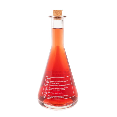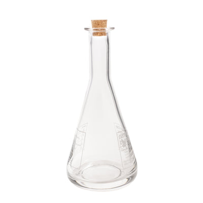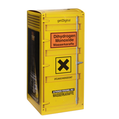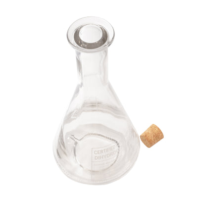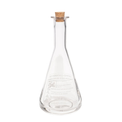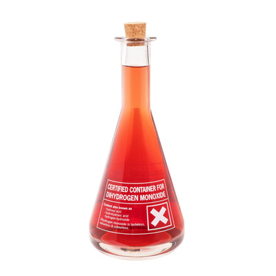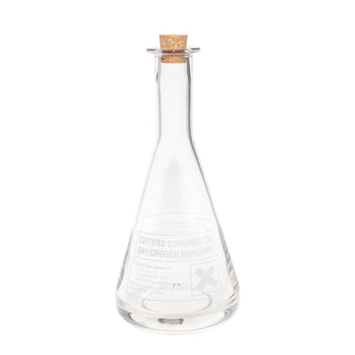 De Waterkaraf DHMO van glas ziet eruit alsof je hem uit een chemisch laboratorium hebt meegenomen. De vorm komt overeen met een Erlenmeyer-kolf, terwijl aan de buitenkant diverse (wetenschappelijk correcte!) waarschuwingslabels zijn gedrukt. En zodat je DHMO niet verontreinigd wordt, wordt deze karaf geleverd met een kurk om af te sluiten.