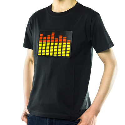 Questa maglietta con equalizzatore ha un equalizzatore grafico incorporato: le barre sulla parte anteriore della maglietta si muovono in base ai rumori di sottofondo e mostrano quindi i rumori che stanno arrivando. Simile a un normale equalizzatore. Perfetta per concerti, discoteche o semplicemente per la prossima riunione di geek. Poiché la sensibilità della maglietta può essere regolata, la maglietta può visualizzare qualsiasi cosa, dalle conversazioni alla musica da discoteca.