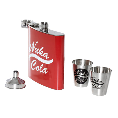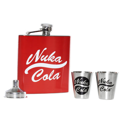 Se riesci a mettere le mani su una buona goccia, è una buona idea portarla nella Fiaschetta di Fallout con bicchieri di grappa il più velocemente possibile! Questa robusta fiaschetta in metallo con il design della Nuka-Cola è facile da portare nella tasca della giacca ed è quindi ideale per rinfrescarsi durante le tue avventure. Per permetterti di brindare con i tuoi fedeli compagni dopo una lunga giornata, il set include una imbuto include anche due bicchierini da grappa in metalloche riprendono il design della Nuka-Cola. Ma è meglio non riempirli di coca cola, altrimenti si riempirebbe solo l'interno della fiaschetta ;)