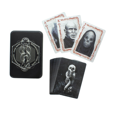 Il Carte da gioco di Harry Potter "Arti Oscure si abbinano a Voldemort, come suggerisce il nome, come i capelli rossi ai Weasley: le 52 carte da gioco e i 2 jolly raffigurano l'avversario di Harry, i Mangiamorte o, in modo molto classico, i teschi. Il set è disponibile in una confezione scatola in metallo goffrato che è decorata con il marchio oscuro. Ma attenzione prima di iniziare: Le maschere dei Mangiamorte sono le facce da poker per eccellenza ;)