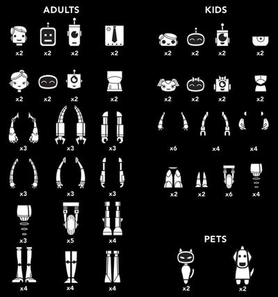 Puoi attaccare i membri della tua famiglia a piacimento scegliendo tra un totale di 50 pezzi singoli "mix and match" - le possibilità di combinazione sono praticamente infinite e ci sono abbastanza pezzi per rappresentare completamente sia la prima che la seconda famiglia - molto più simpatico e geek di qualsiasi cartello di avvertimento "Bill on board".