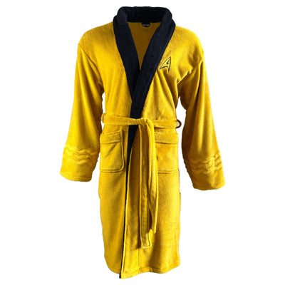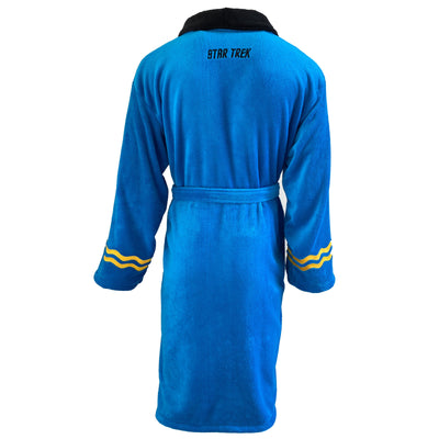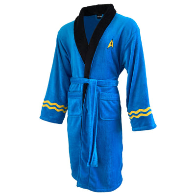 L'accappatoio è basato sul design dell'uniforme della Flotta Stellare di Spock in colori coordinati. È stata prestata attenzione anche a piccoli dettagli, come le insegne della Flotta Stellare e il grado rappresentato dalle strisce dorate sul braccio. Ma a differenza delle uniformi originali della serie, questi accappatoi sono morbidi e accoglienti!